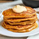 Transfer your beautiful pumpkin pancakes to plates and stack them high! Drizzle with maple syrup or add toppings like whipped cream or pecans for extra indulgence.