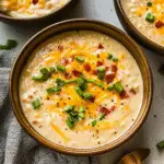 Add Toppings: When ready to serve, ladle soup into bowls and sprinkle with shredded cheddar cheese, crumbled bacon pieces, sliced green onions, and dollops of sour cream for that ultimate comfort experience.