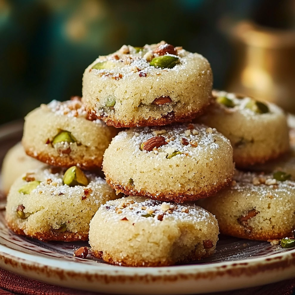 Pistachio wedding cookies are delicate, buttery treats filled with crushed pistachios, often rolled in powdered sugar.