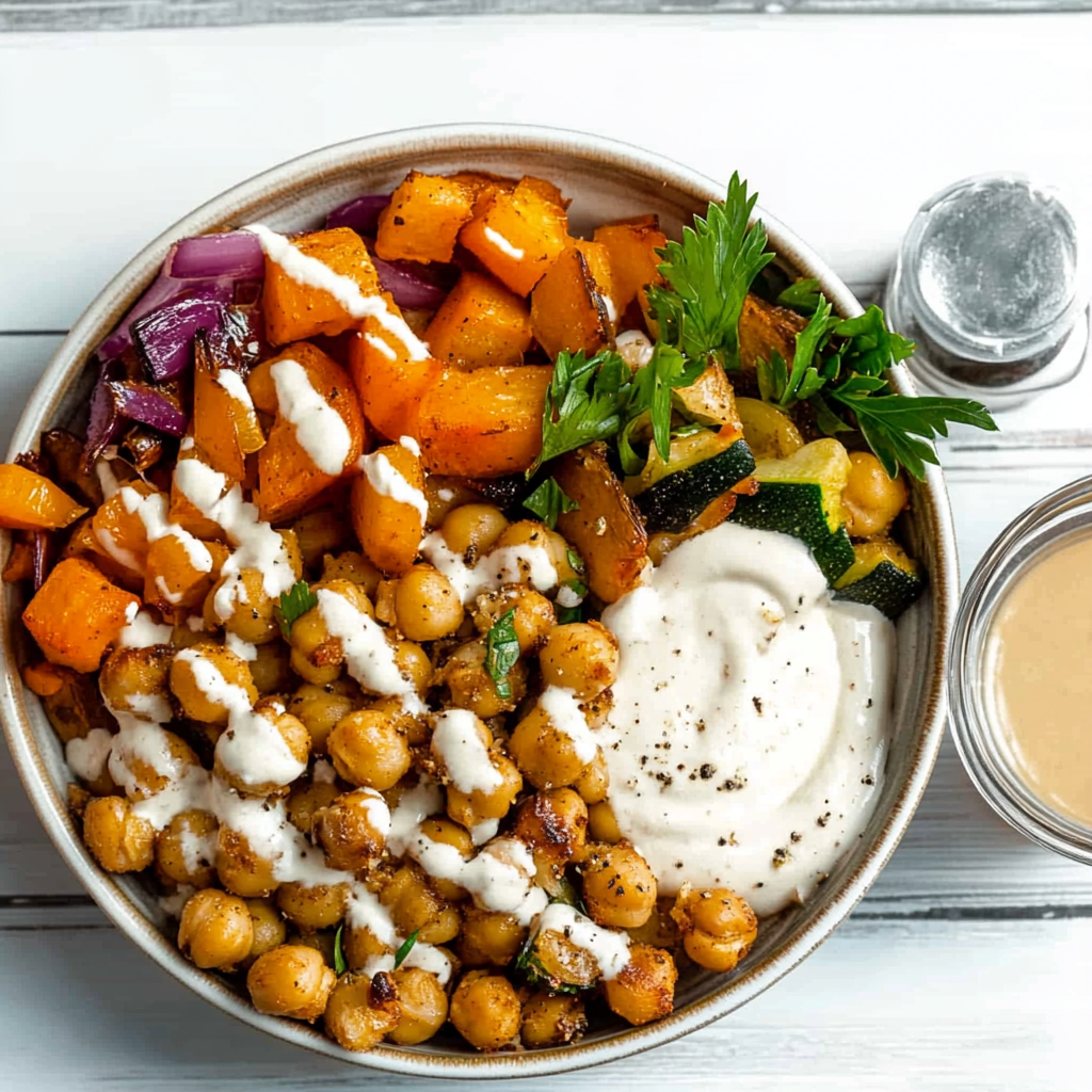 Roasted Veggie and Chickpea Bowl is a vibrant dish that dances on your palate like a Broadway star at opening night. Imagine crispy roasted vegetables mingling with protein-packed chickpeas, all draped in a tangy dressing that sings harmony to every bite. It’s a bowl of happiness that’s not just good for your taste buds but also for your health.