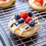 While they cool, whip up that creamy frosting by beating cream cheese with powdered sugar and vanilla until smooth. Spread generously on each cooled cookie like you’re icing a cake! Top with an artistic arrangement of strawberries and blueberries—voila!