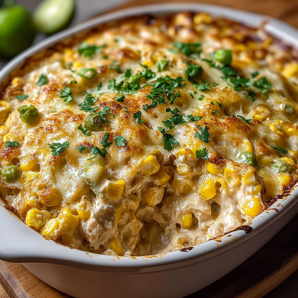 It’s a creamy casserole combining shredded chicken, corn, spices, and cheese, inspired by elote.